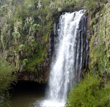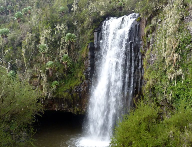 Aberdare National Park holds the record as the highest game park in the world. The park is also home to Karuru and Gura, two of Kenya’s tallest waterfalls, each plunging down the Aberdares in three stages. Karuru drops 272 M (894 FT). Gura, also known as Magura, is 305 M (1,000 FT) tall. Near the waterfalls is an extraordinary growth of moss and giant vegetation peculiar to the East African mountains.